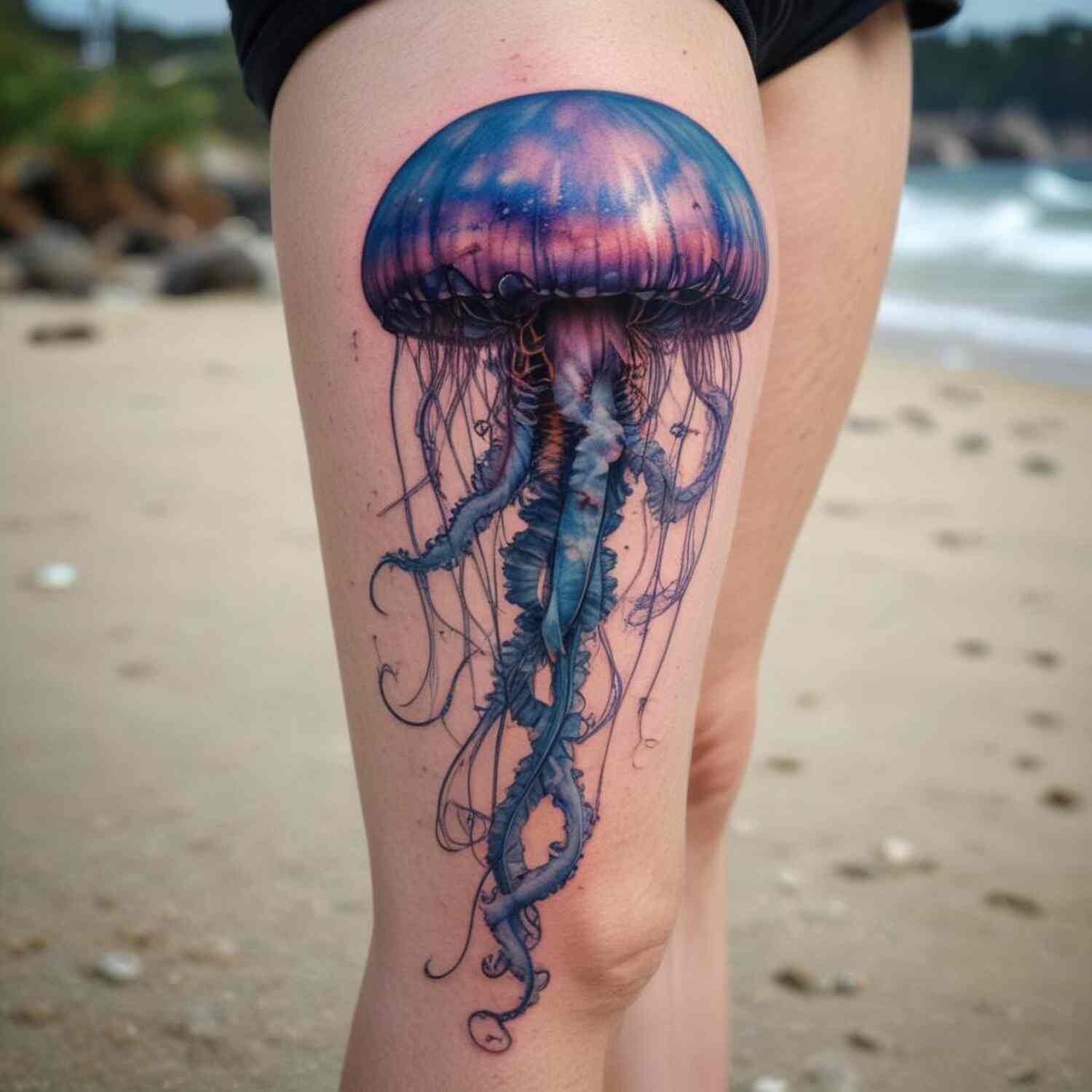 This impressive tattoo turns your thigh into a vibrant ocean scene. A lifelike jellyfish commands attention at the center, its tentacles gracefully wrapping around your leg. The artist can meticulously capture the jellyfish’s translucent bell and delicate frills. As you move, it appears as if the jellyfish is swimming alongside you.