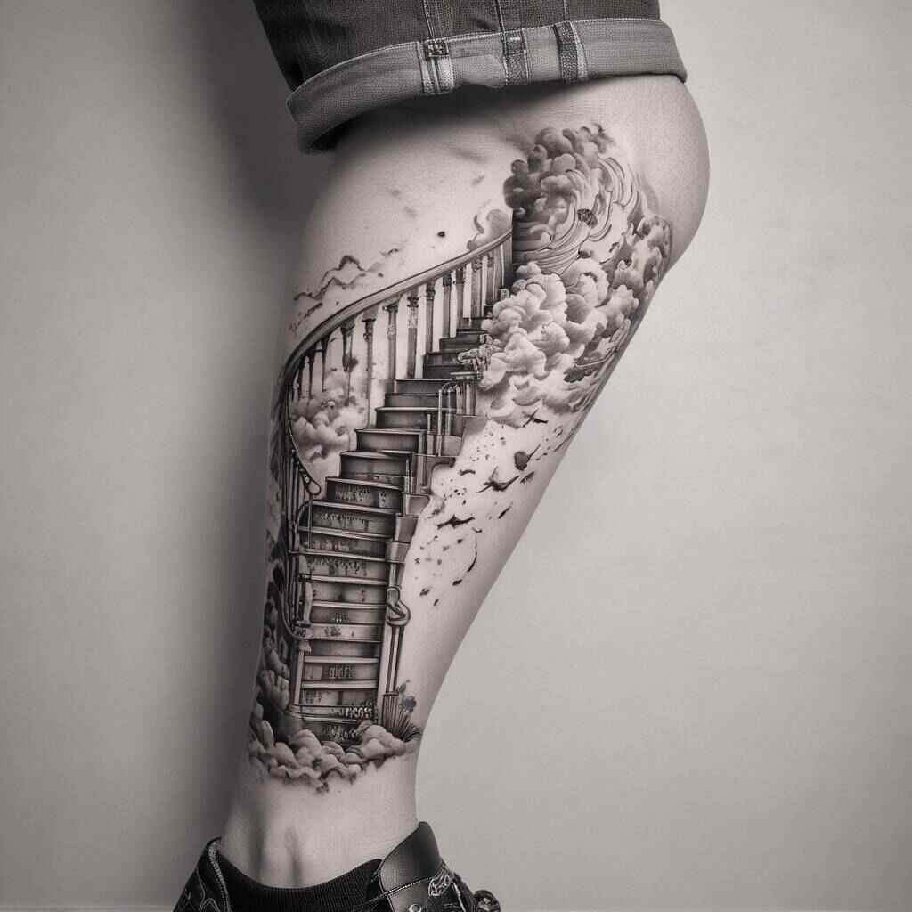 The stairway can be depicted in many forms, from ornate stone steps to minimalist geometric shapes, allowing for personalization. These tattoos appeal to music lovers, spiritual seekers, and those drawn to life as an upward journey.